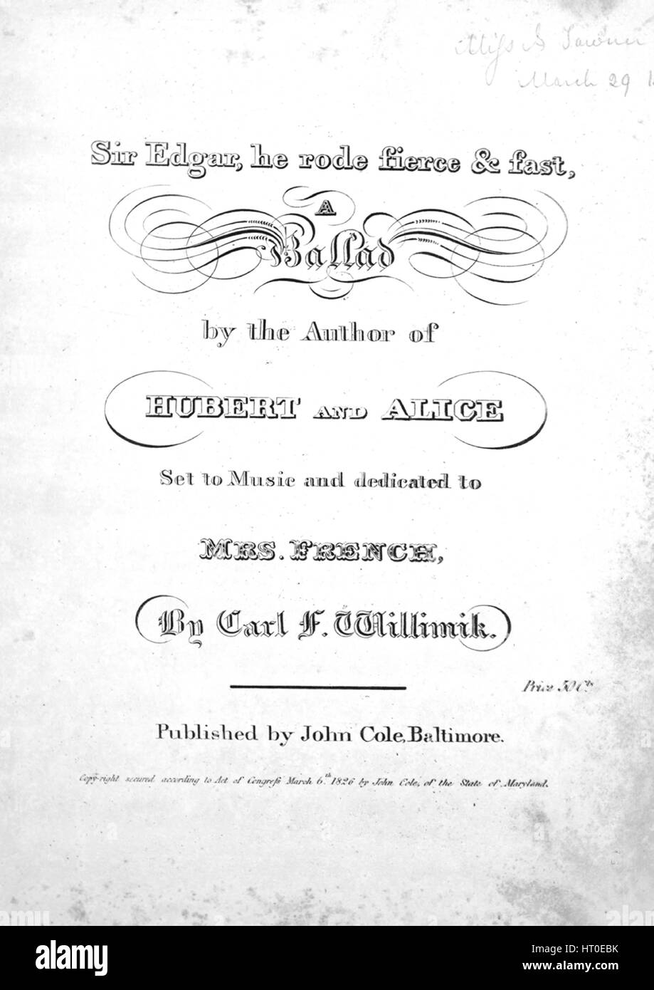 Titelbild Der Noten Des Liedes Sir Edgar Er Ritt Hart Und Schnell A Ballad Mit Ursprunglichen Autorschaft Noten Lesen Set Musik Von Carl F Willimik Usa 1826 Der Verlag Als John Cole